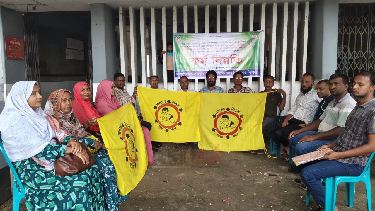 বেতন গ্রেড উন্নয়ন, নিয়োগবিধি সংশোধন ও ইন-সার্ভিস ট্রেনিং ডিপ্লোমাসহ ছয় দফা দাবিতে সিরাজগঞ্জের রায়গঞ্জে কর্মবিরতি পালন করছেন স্বাস্থ্য সহকারীরা।